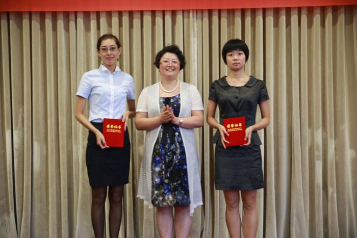 9、集團(tuán)總裁助理、工會(huì)主席王育青(中)為一等獎(jiǎng)獲得者頒獎(jiǎng)。