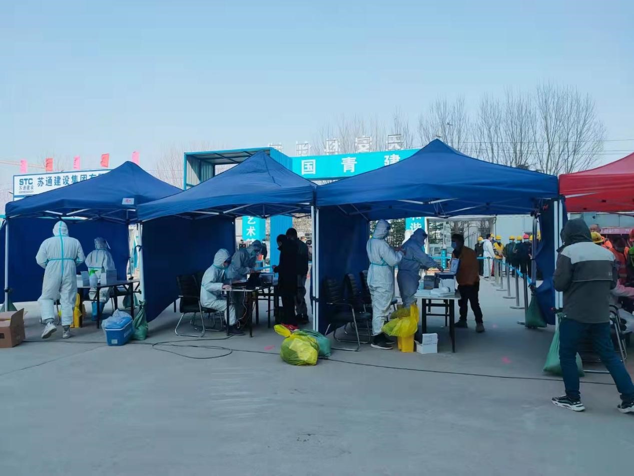 3月9日,集團(tuán)青島天安科創(chuàng)城一期產(chǎn)業(yè)項(xiàng)目部主動(dòng)承擔(dān)周邊十個(gè)建筑工地及部分社區(qū)企業(yè)職工的核酸檢測(cè)任務(wù),負(fù)責(zé)維持秩序、登記錄入、消毒殺菌、應(yīng)急保障等工作。從早上六點(diǎn)到下午六點(diǎn),經(jīng)過(guò)十二個(gè)小時(shí)緊鑼密鼓的高效工作,順利完成了核酸檢測(cè)任務(wù)。3月12日下午又緊急承擔(dān)第二輪核酸檢測(cè)任務(wù),3月15日組織第三輪核酸檢測(cè),三次累計(jì)檢測(cè)4300余人次。