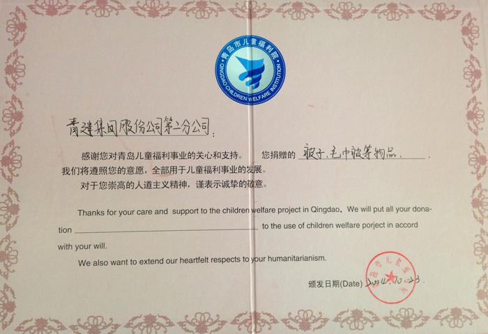 10月23日,在二分公司工會(huì)主席郭美玲帶領(lǐng)下,公司一行前往青島兒童福利院“藍(lán)天之家”,代表公司領(lǐng)導(dǎo)及全體員工為福利院兒童獻(xiàn)出愛心。