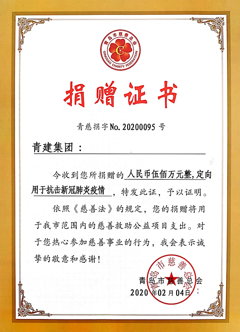 2月4日,青建集團向青島市慈善總會捐款500萬元,用于抗擊新型冠狀病毒感染肺炎疫情所需的各項緊急救助。