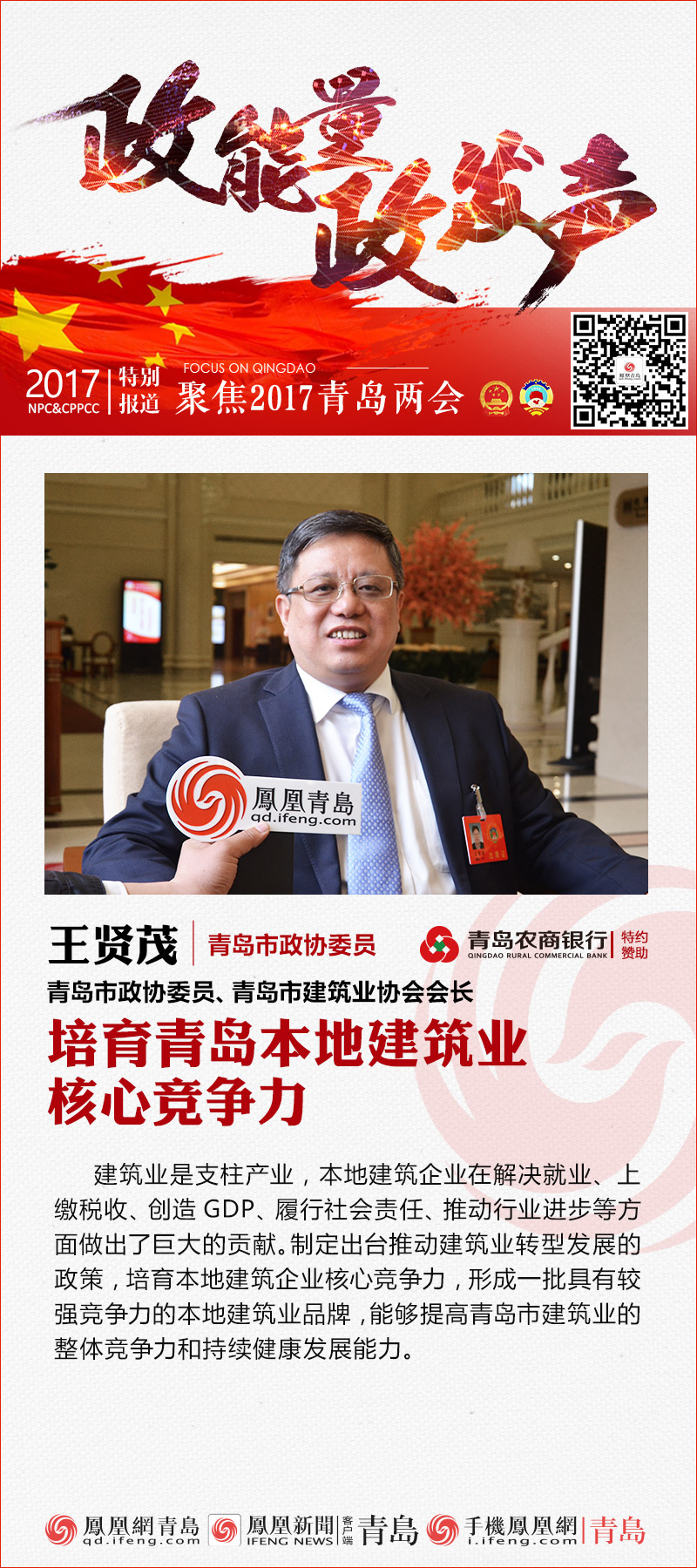 建筑業(yè)是青島市的支柱產(chǎn)業(yè),也是人民的家園創(chuàng)造者。來自國清控股集團有限公司總裁兼青建集團股份公司董事長王賢茂,同時也是青島市建筑業(yè)協(xié)會會長,對如何促進青島市建筑業(yè)的持續(xù)健康發(fā)展,他提出了許多建議。